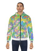 Stay warm and stylish with our zipped fleece jacket, designed with Gen Z in mind. This customizable all-over print zip hoodie boasts seamless design, ensuring no visible white lines at the seams. Featuring a roomy hood, large front pocket, and black zipper, it's the ultimate winter pick. Crafted with 86% Polyester and 14% Cotton, it offers a classic fit and a comfy feel. Rock the look with white thread accents, custom cut and sewn. Proudly assembled in the USA from globally sourced parts.